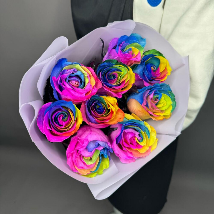 Лента атласная - 1 шт. Радужная роза - 9 шт. Дизайнерская упаковка - 1 шт.