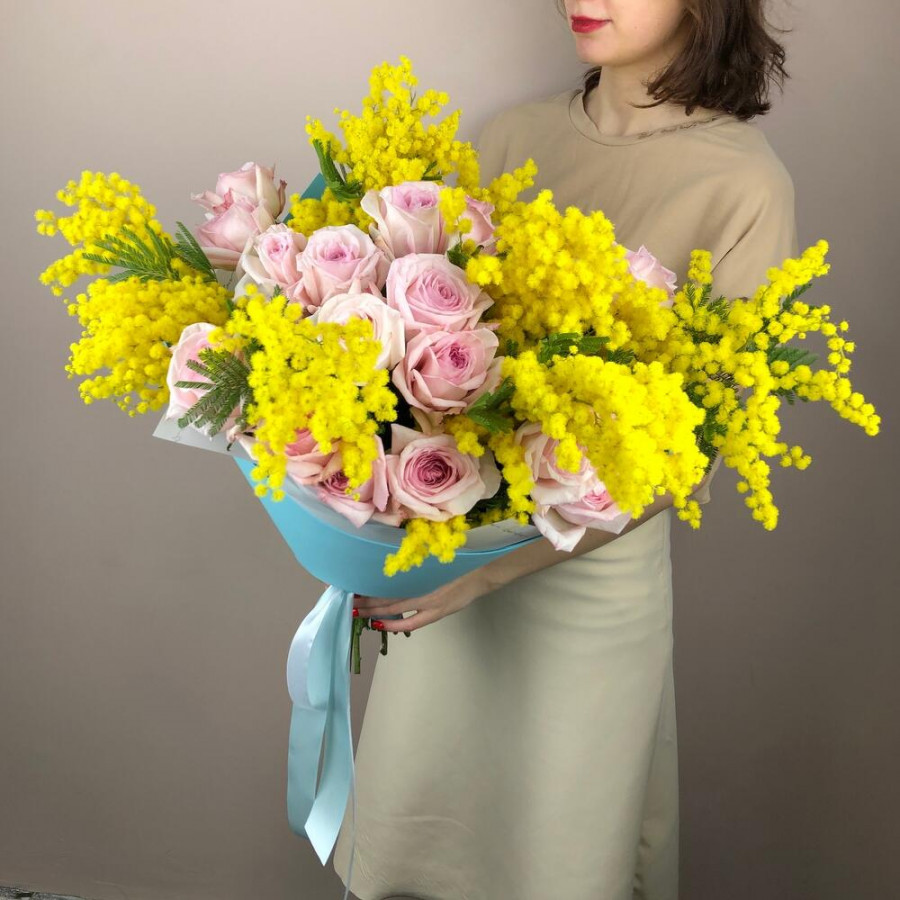 На фото букет из мимозы и розы. В составе: мимоза 10 шт, роза 25 шт, крафт-бумага 1 шт, атласная лента 1 шт, . Все цветы свежие и ароматные, букет красиво оформлен и отлично подходит для подарка. Доступна доставка цветов или самовывоз.
